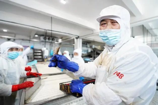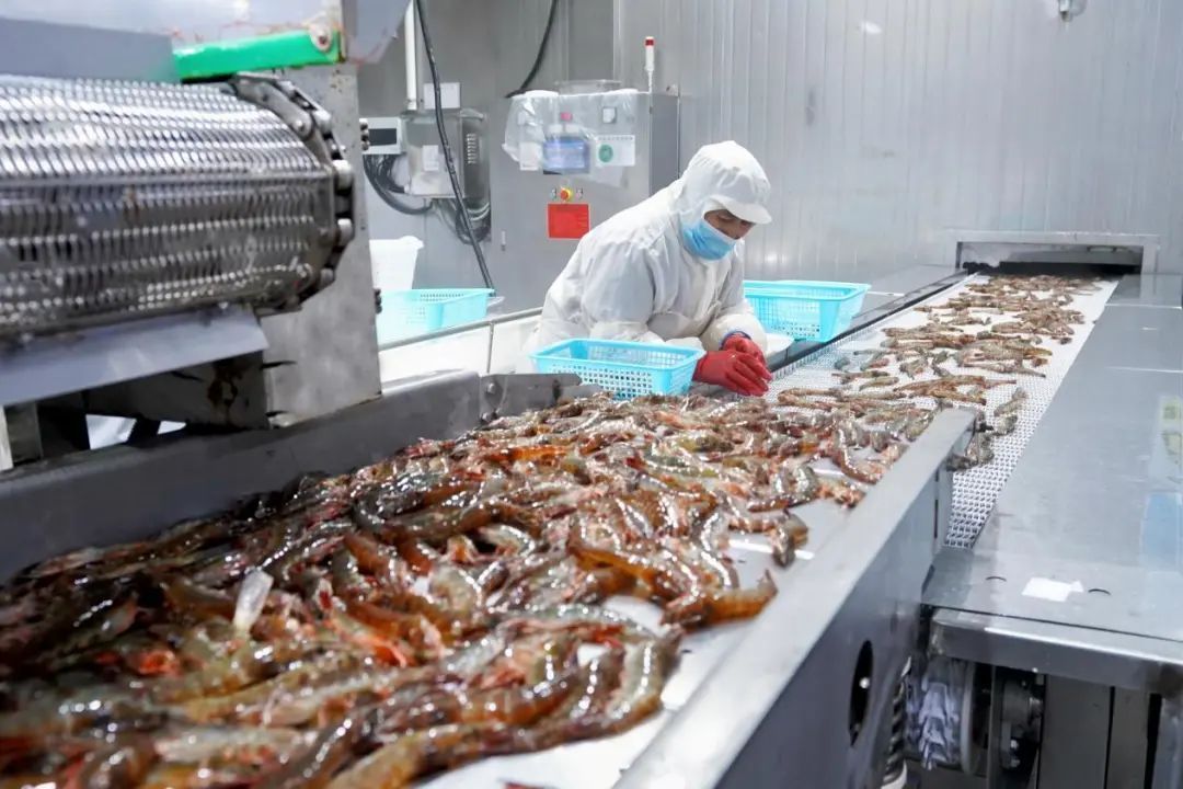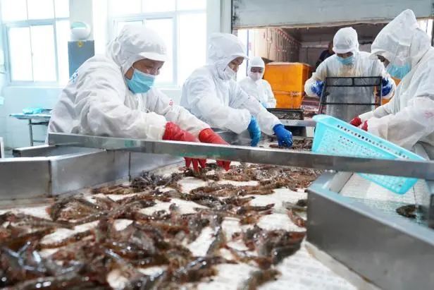 加工厂内,工人们精心挑选优质大虾