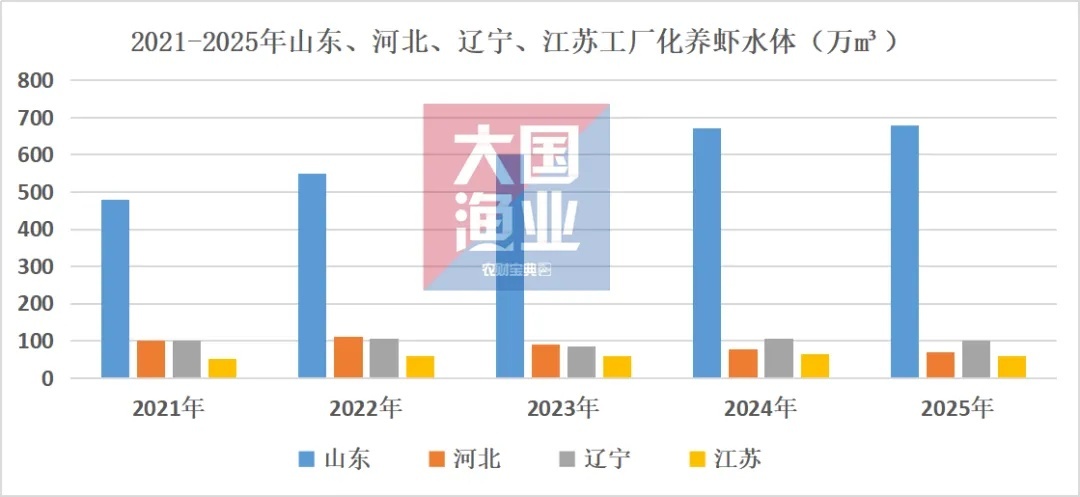 山东作为北方工厂化养虾主产区,其工厂化养虾水体约占北方工厂化养虾水体的65%-75%。最近五年,山东工厂化养虾水体整体保持稳步增长态势。2021年,山东工厂化养虾水体仅有约480万m³,预计2025年养虾水体约有680万m³,短短4年时间,养殖水体增加了约200万m³,发展速度领跑全国。通威、海大、正大等都在山东布局工厂化养虾,掀起水产新基建浪潮。